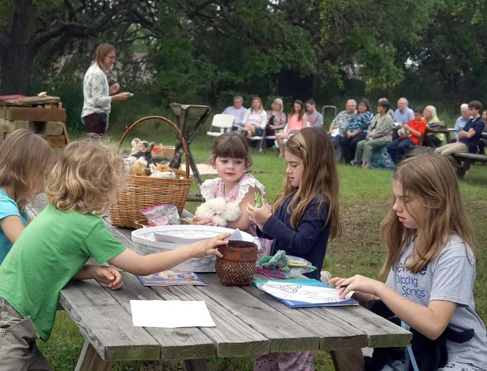 New Life is an outdoor church community that worships in God's amazing creation, under beautiful sprawling oak trees. Everyone is welcome at New Life, including animal friends. Being an outdoor church allows for children to be active, playful, and present during worship, in nature under God's sky.